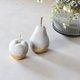 这款水果摆饰结合了有机质与无机质的设计元素,展现出微妙的平衡感,并采用半金设计,水泥材质的灰色与底部金色涂料形成强烈对比,营造引人注目的视觉效果,进一步提升整体的质感与稳重气质。无论是单独展示或与其他水果摆饰组合陈列,都能为空间增添独特的艺术美感。