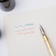 将笔尖轻轻蘸入墨水(墨水的液面需超过笔尖中央墨孔),书写时请避免用力过度以防墨量过多或刮纸。建议选用沾水笔专用墨水,因其附着性佳,能让书写更加顺畅且不易晕染。