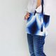 设计师将原本的几何夹染融入渐层染色,让原本理性感的几何图案更加有了温柔的手染风格。大面积重复效果下,像似有着镜面效果,看得人目眩神迷。 二面都很美好的拖特包设计款,有内袋,有底板,有挂勾,有宽肩带,舒适与美感,多重美好一次到位。