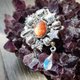 ❖ 太阳石与月光石项链:主石为太阳石,搭配蓝光月光石垂坠。金属材质为925银与999银,整体尺寸(长x宽,含下方垂坠)为41x30mm,搭配46cm925银颈圈。