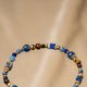青金石以深蓝色为主要的基底色调,并因内含母岩方解石而生成的白色纹路,其金色点状的图样是因矿石中的黄铁矿和铬而形成,表面如星空般,充满奇幻并丰富的色彩。主要由蓝色矿物组成的综合体,数千年古埃及人就发现此天然石,不仅使用于珠宝饰品设计中,也因其色彩及成分而作为绘画的颜料,其色彩称之为"群青蓝"。