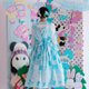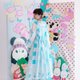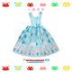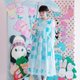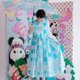 有两重花边搭配,印花图案上身没见位置会有所不同,裙摆有里布,两侧有口袋。腰间有绑带,可前后面穿着,上身正反面不同设计,下边图案是穿蓝色服装的小动物撑伞雨中漫步。