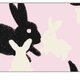 The image, inspired by a black rabbit silhouette, evolved from a sketch into a playful, childlike print, reminiscent of an illustration. The addition of a light-hearted little white rabbit adds a rhythmic companionship to the composition, pulsing with images of innocence, agility, and protection."