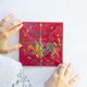 作品采全手工五色绢印,印制于含有金丝纤维的红色纸材上,纸张在光线下隐约闪耀,质感细腻而独特。