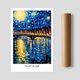 《桥上星夜 Starry Bridge》承袭梵谷式的涡旋笔触与浓烈色彩,画面捕捉了夜空、河水与桥梁的交响。满月与繁星在深蓝的天际闪耀,城市的灯火沿着桥墩绵延,映照于水面上形成金色波光,仿佛音符般跃动。蓝与黄的对比强烈却和谐,营造出浪漫而梦幻的夜晚氛围。