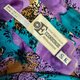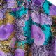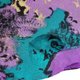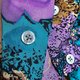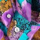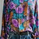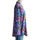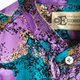 这是一件宽松版型的真丝衬衫,特色是紫色与蓝绿色的抽象图案。