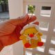 针织小鸡钥匙圈 100% 手工制作 小黄鸭 充满活力的黄色小鸡,戴着白色针织帽,正面系有蝴蝶结。
