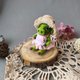 绿牛穿着粉红色的衣服,帽子,有一个小篮子的苹果。