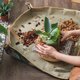 换盆动作包含:整理根系、拌土、将新介质及植株放入新盆器内、浇水、施肥、喷洒叶面(视情况)以上动作皆可在换盆垫上执行能有效保持环境整洁