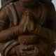 这些是静冈县滨松市大本山方广寺所藏的木喰佛。木喰上人访问此地时,已经进入了创作佛像的成熟期,并且据说从这时候起,他的特有微笑开始显现。这尊高达人身的模型,被精细地雕刻成手掌大小,完美呈现了木喰上人与平民生活息息相关的精神。