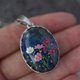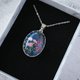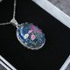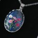 这款精致的椭圆形坠饰,以拥有深邃群青色泽的天然石“青金石”为主体,点缀着秋季花卉“大波斯菊”的图腾。