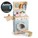 这是一款多功能儿童洗衣家家酒组,从洗、烘、烫到折衣,一站式完成。附一个精致藤编洗衣篮,用来收集脏衣物。洗衣机上方的洗剂盒可放入两颗洗衣锭,按下按钮即可开始运作,搭配两个会发出喀哒声的旋钮,让孩子选择“洗程”与“脱水”转速。