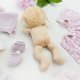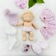 娃娃穿着棉质尿布、棉裤、连身裙、针织毛衣、针织帽和钩针鞋。