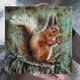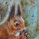 在这幅当代画作中,一只红松鼠栖息在一根风景如画的原木上,小爪子里拿着一颗珍贵的坚果。混合材质:面板画布、油画、压克力、纹理贴