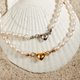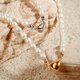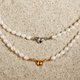 这款项链以现代简约美学为基础,融合珍珠的纯净光泽与金银双色爱心扣的时尚元素,展现优雅、浪漫与精致并存的女性魅力。