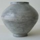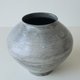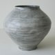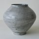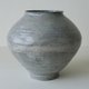 铁质丰富的土胚表面,用棕扫把刷上白色泥浆,简单随意的笔触、不均匀的刷痕,使得土的原色与泥浆之间的对比有种趣味,并使用灰类调制釉药,经过还原烧成后,形成蓝灰色的透明釉,透明釉色隐约透出陶土、泥浆的面貌。