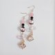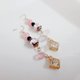 美丽的方形吊饰搭配闪闪发光的氧化锆石、梦幻般的粉红蜻蜓珠,看起来像夜晚的樱花,以及两种颜色的丰满可爱的水滴珠,打造出时尚、摇曳的作品。