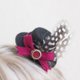 这是一顶装饰有棉质缎带、手工树脂吊饰和羽毛的迷你帽。