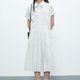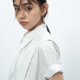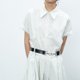 选用棉涤混纺面料,强韧的高支棉纱密纺工艺增加了柔软性和垂顺度,色泽纯正稳定,轻盈耐穿。经典的尖领衬衫裙因为衣身两侧的连贯飞扁设计,形成假两件效果。下半身裙片采用不对称半百褶半平面裙型,整体风格既学院又温婉,通过配饰的调节可以打造百变风格。