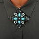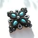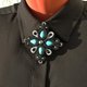 这款优雅的黑色胸针点缀着绿松石,采用索拉兹刺绣(soutache embroidery)工艺精心制作。材质包含:珠饰、细珠、绿松石仿 कशी(howlite cabochons)以及索拉兹绣线。背面覆盖着皮革,质地轻巧。尺寸为 2.8 英寸(7 厘米)。