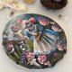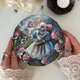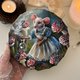 这幅在蘑菇间的仙女小鼠,最初以压克力颜料绘制于圆形棉质画布上。画作主题独特,灵感来自着名的童话故事——穿着蓝色洋装的 pretty mouse lady 与神奇的瓶子,多么充满魔幻色彩的故事!