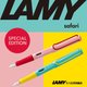 LAMY safari 狩猎者系列cherry blossom夏日粉红以亮红色搭配粉红色的樱花特别版色彩设计,以甜美色调唤起了内心的喜悦,以及季节变化带来的所有欢乐;LAMY safari 狩猎者系列pina colada热带风情以亮黄色搭配奶蓝色,仲夏热带椰林的活泼气息,以及充满活力的色彩更增添一丝阳光。全新创意的双配色混搭色彩,呈现清新独特的风格设计~