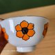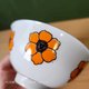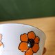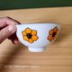 白色底色搭配鲜艳黄色花卉图案,碗缘有银边。