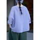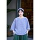 圆领,领口一抹撞色,大落肩袖,宽宽的,大大的,好看。箱型的大身,后片是开襟至底,一排纽扣,可以将衬衫前后两穿,将门襟朝前,解开纽扣也是小防晒衣。