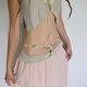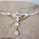 白色波西米亚腰带,饰有玫瑰石英和彩虹月光石。它装饰有贝壳、黄铜太阳吊坠、黄铜螺旋和黄铜珠。它有一个领带封口。