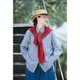 翻领,开门襟,纽扣也是条纹的。落肩式长袖,袖子需要长一点来增加她复古的摩登感,宽宽的袖克夫和扣子也是她的重点所在。
