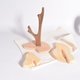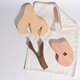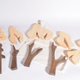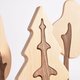 木制玩具树的根部、树干和树冠部分采用三种不同的树种自然着色,不使用油漆或有毒物质。象征树根的部分由山毛榉木制成,树干由胡桃木制成,树冠由松木制成。除了灌木丛外,其他 4 棵树都有山毛榉木支架,可以塑造树根部分,以便它们可以站立。树木的厚度为15毫米。它们的长度约为20厘米。