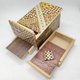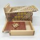 这是一款五寸尺寸的日本机关盒。“寸”是日本传统的长度单位,一寸约等于 1.18 英寸 (约 3.0 毫米)。此款带有抽屉的机关盒,共有十个步骤才能打开。第七个步骤打开盖子面板,第十个步骤才能拉出抽屉。