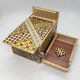 这款十步机关的寄木细工机关盒,内置一个可抽出的小抽屉,同时还能收纳一个内部的小盒子。这个小盒子本身没有特别的机关,只要一个简单的步骤就能打开,非常适合用来存放卡片等小物。小盒子的盖子表面,采用了纯木质的市松编织寄木。