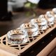 七只水晶供杯 + 雕花供盘,杯与杯的距离相距一粒米宽,代表与师长不分离的意涵。