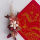 以新年最经典的暖红色调为主轴,搭配金色、粉红与细致花材层次,呈现稳重又喜气的年节氛围。花饰中特别加入 台湾栾树果实,带着微微草莓般的红润感,象征“果实累累、收获丰盛”,也寓意新的一年,努力都能开花结果、顺顺迎来好消息。