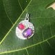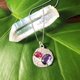 以带有捶击纹的圆形银盘为基底,镶嵌着紫水晶与红宝石的坠饰。 两颗鲜明的彩石仿佛在舞动,充满生命力。