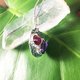 以带有捶击纹的圆形银盘为基底,镶嵌着紫水晶与红宝石的坠饰。 两颗鲜明的彩石仿佛在舞动,充满生命力,是一件充满跃动感的作品。