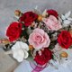 **花材|**主花为不凋玫瑰花(永生花)+扩香索拉花,配花含不凋绣球花与其他季节性花材与叶材